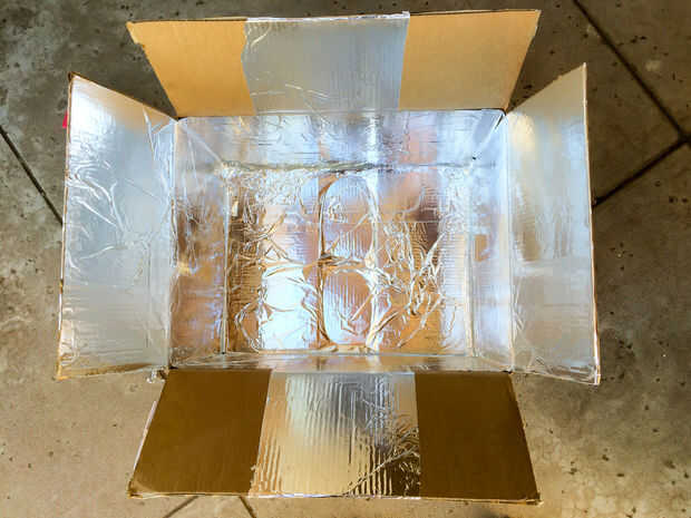 Escogí forrar la caja con papel de aluminio ya que es altamente reflectante y puede actuar como una barrera contra el agua. Yo había superpuesto todos los rincones para que si derramar el agua en el cuadro de no arruinarlo. El adhesivo en aerosol es fácil de aplicar y se adhiere fuertemente a la caja.