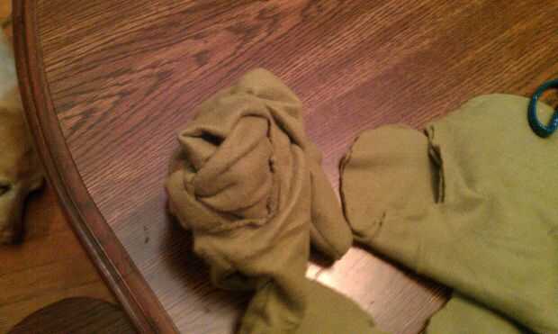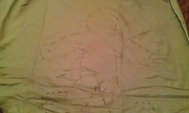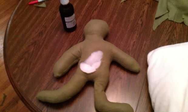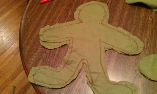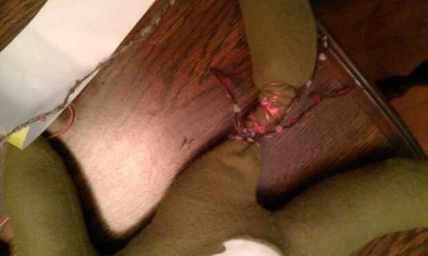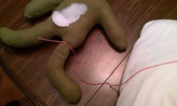 First outline your body on the fleece. Luego cortar dos piezas idénticas. 5" más grande que su contorno. Coser las dos mitades juntas siguiendo su contorno. Orificio en el abdomen para Mecharla. Luego tomar su almohadilla ONU-cosas, luego volver a rellenar en rosa. Cosas apretadas y artístico con él! Esculpir y moldear el relleno manteniendo apretado. Entonces usando el lazo de hilo funky una pierna para que se vea como era masticado hasta el hueso y sólo colgado tendones. También puse un pedazo de hilo alrededor del cuello para darle una mejor cara definida.