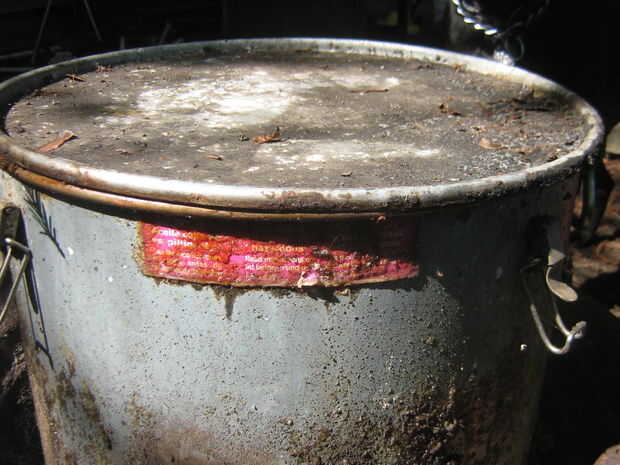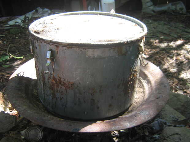 -1 decente tamaño recipiente de metal redonda y resistente al fuego/calor. Un viejo cañón metálico sería bueno si cortarse, pero la tapa extraíble es esencial para la limpieza y tal.