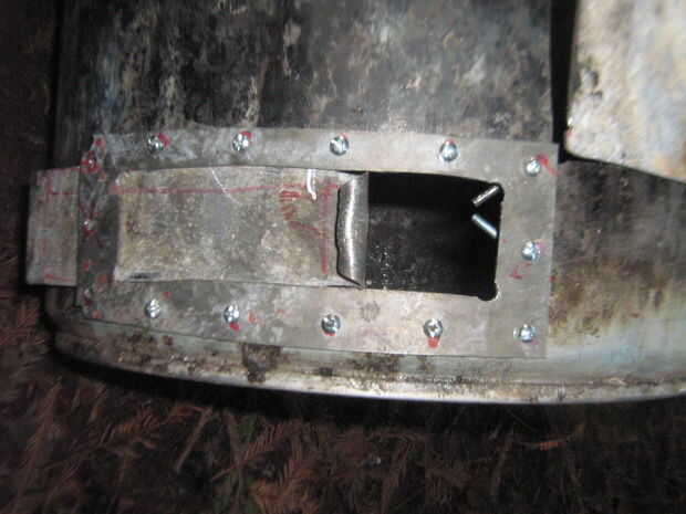 También pre-cabe la puerta de alimentación. Lo hice de la misma manera, pero hice una bisagra en un momento. Te darás cuenta estos tornillos no se cortan en mi pis, como espero ajustarlas después de usar y luego recortarlo. En la puerta, perforó la bisagra apropiada colocación de agujeros y que ponga la cabeza del tornillo en el interior de la puerta. Esto es para eliminar tanto espacio/espacio como usted que puede. Atornillar la bisagra en la puerta. Luego revisar nuevamente el espacio para el accesorio al recipiente. Marcado y perforado y dedo apretado los tornillos, esta vez con la cabeza fuera. Mismo proceso de la segunda bisagra. Que ajusta perfectamente porque medido y construido que es uno mismo. Un buen consejo al construir cosas tontas como esta.