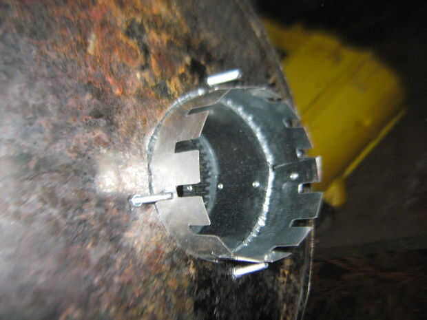 Taladré agujeros en la parte ancha de la brida y a lo largo de la parte superior. Es cómo fijo la chimenea en la tapa. La próxima vez intentaré averiguar una manera de hacer esto que no se pega hacia fuera durante el transporte. Tal vez una chimenea desmontable.