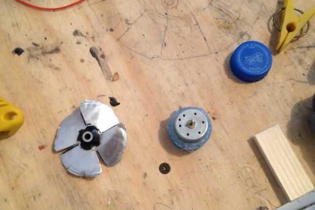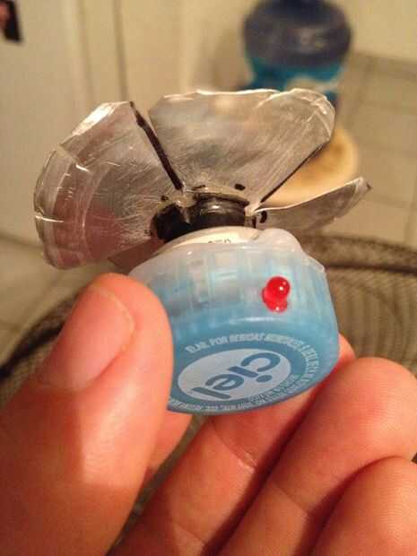 Empuje el motor (con la electrónica en la espalda y asegurándose de que el LED va en el agujero) en la tapa de la botella. Utilice pegamento caliente alrededor del motor para fijar en la tapa de la botella.