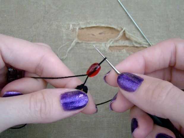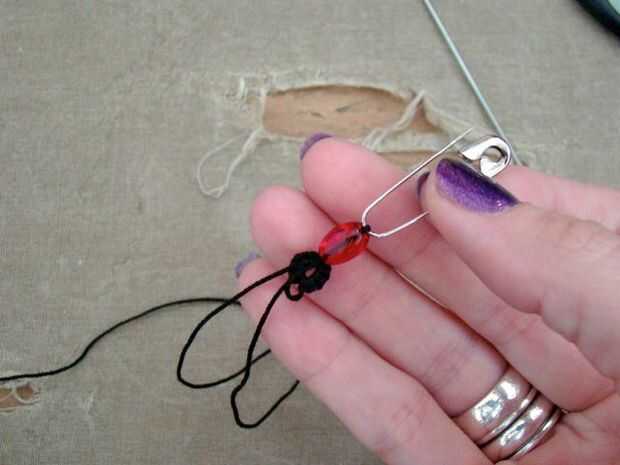Jalar por el grano y colocar el alfiler o un clip en bucle y tensar el hilo de trabajo. Esto mantendrá el cordón en su lugar hasta que nos unimos a lo anillo de cuerpo.
