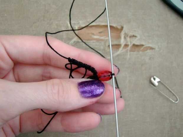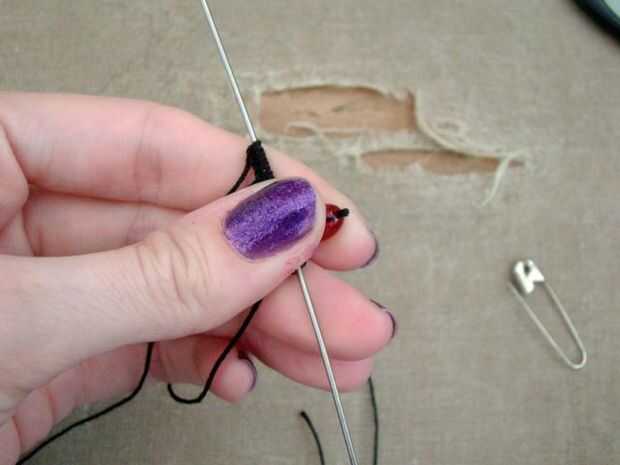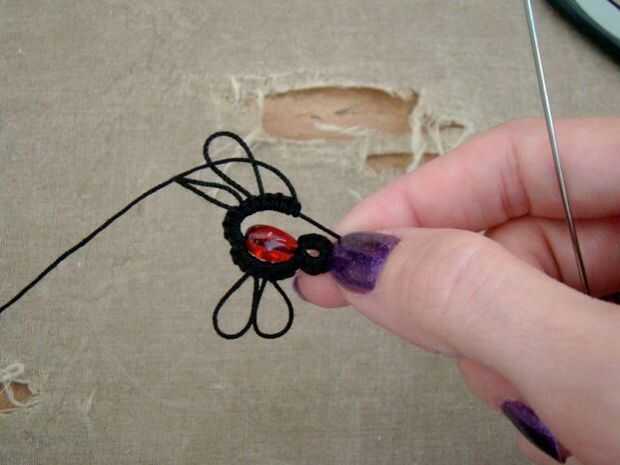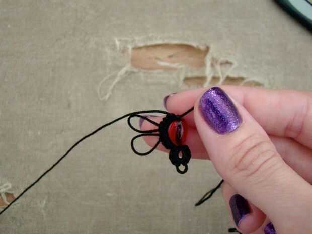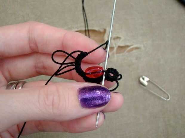Pase la aguja por el espacio por encima de la aguja y tire firmemente, atar y ocultar extremos recorte de exceso de hilo. Clip de picots de pierna y realiza.