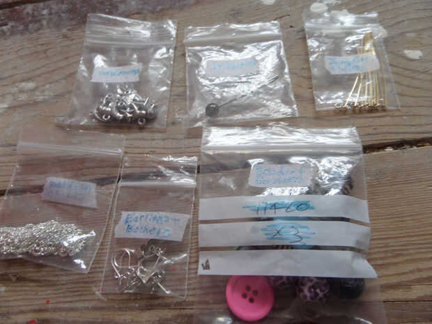 Así que primero vas a tener que decidir lo que va bolsas y lo que no! Tuve mis alicates, pegamento, tapas de botellas, esparcidor, pluma, papel o libro y habrían tenido los espacios en blanco del anillo (si tuviera alguno no utilizado) no en una bolsa y cada cosa en las bolsas.