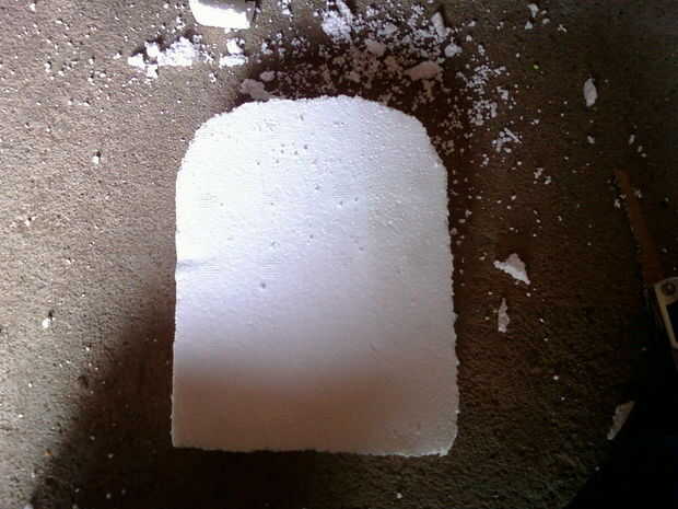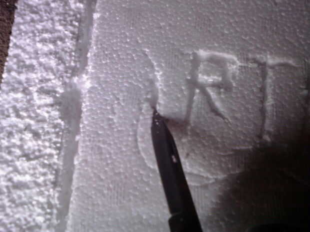 Ahora para el tallado; su muy simple, todo lo que necesitas es un cuchillo pequeño o un cuchillo del exacto para trazar la frontera (si quieres una, no todas las piedras de cabeza tienen fronteras) y también el epitafio, como el medio RIP. Entonces trazar un roung el rastro, con el cuchillo en un ángulo y luego sólo sacar la espuma con el cuchillo. Igual va con diseños en el epitafio e incluso grietas en los bordes.