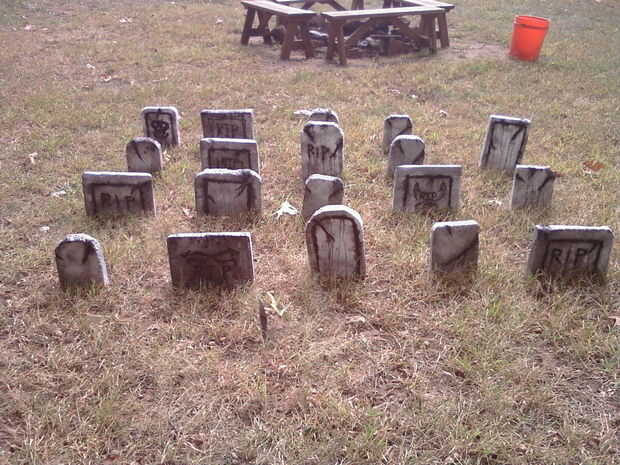 Finalmente lápidas está listo para el patio, todo lo que necesitas es obtener algunos dowles, cual vienen en un paquete barato! Sólo lentamente empuje dos dowls en la parte inferior de sus lápidas, pueden llevarlos a cabo encontrar el lugar para ellos en el patio, martillo los tacos en el suelo y sólo Deslice las lápidas justo sobre los tacos. Hacer esto para cada piedra sepulcral, y en ningún momento tendrás un mini patio de la tumba; o dependiendo de cuantas va a hacer un patio de la tumba completa con sólo estos.