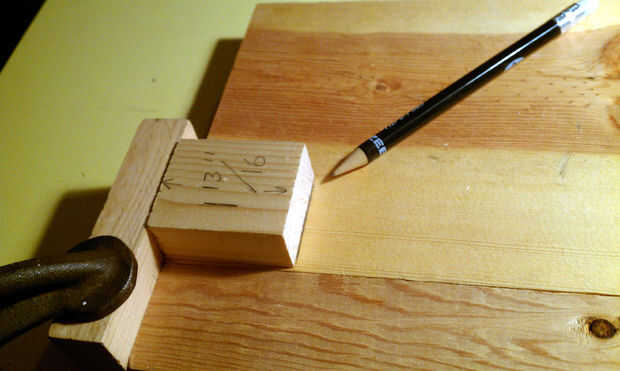 En este paso el dado cortes están marcados en uno o ambos de los tableros laterales en preparación para el corte. Si usted necesita marcar ambas juntas depende del método real que usará para hacer los cortes. Probablemente usted necesitará marcar sólo una de las juntas y luego cada corte de ranura se hará a ambas tablas antes de configurar el próximo corte de ranura.
