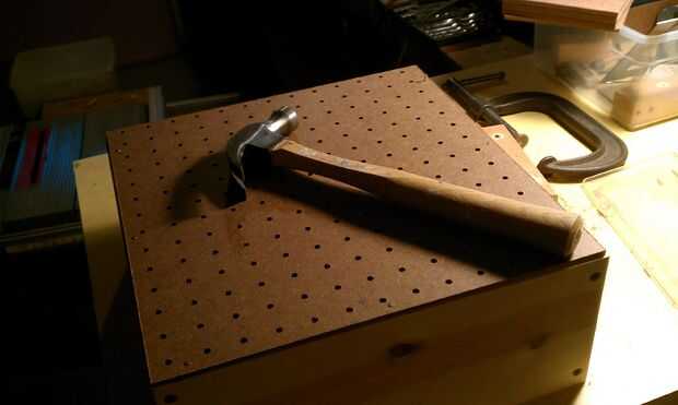 Nota de la foto que elegí con perforado para el tablero de mi gabinete. Elegí pegboard simplemente porque tenía una amplia oferta de en mi tienda y además, quería preservar el más grueso 3/16" madera para usar como estantes en más adelante construidos armarios.