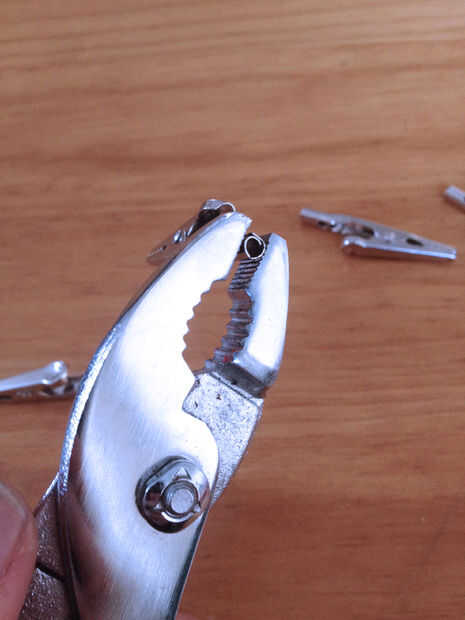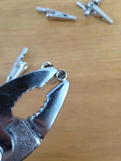 3) utilizando sus pinzas, empuje un extremo del tubo en el otro y comienzo a rodar el metal para hacer la abertura más pequeña.