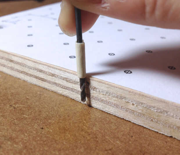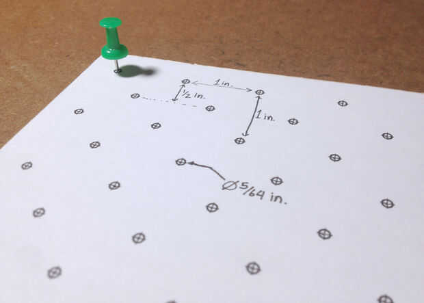 Perfore agujeros en la pieza base madera. No necesariamente tiene que ser en un patrón ordenado, pero que he encontrado útil para dibujar el patrón en mi computadora y luego imprimir para usar como plantilla de taladrado.