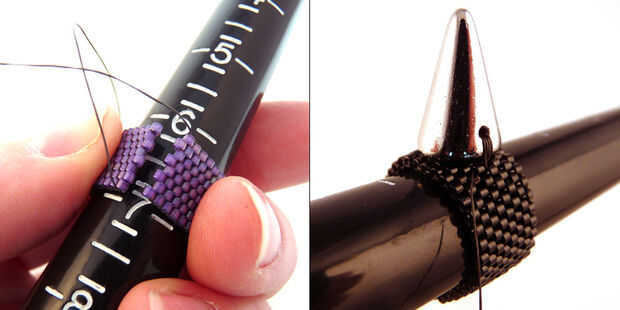 Traer la aguja fuera un grano en el centro de su franja de peyote y recoger el grano de la espiga. Sentarse firmemente contra la tira y entra en ta del grano en el otro lado de la espiga. Trabajar a través de la espiga por lo menos tres veces para garantizar a la franja de peyote.