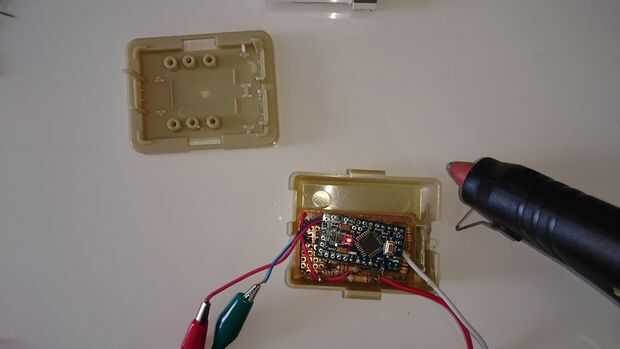 Utilice la pistola de pegamento caliente para fija el PCB en la cubierta.