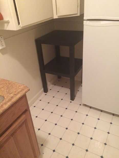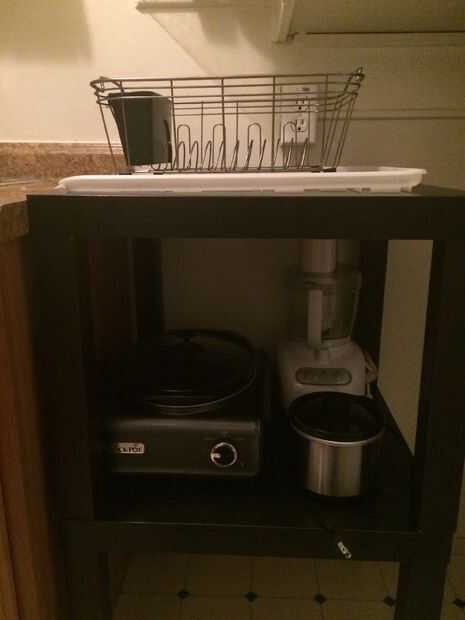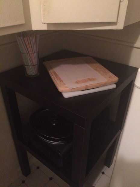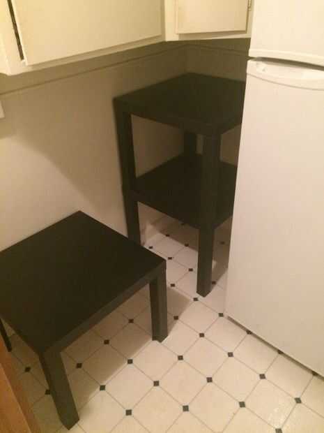 Sin querer gastar mucho/cualquier, creado mi propio contador y espacio de almacenamiento por apilado dos ikea negro falta mesas (tengo 4 gratis en lista de Craig).