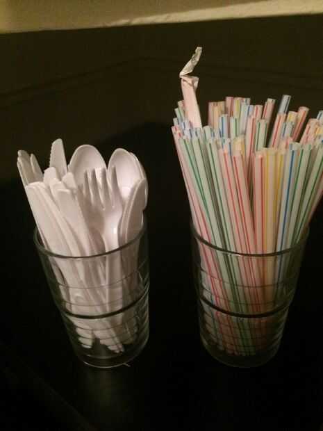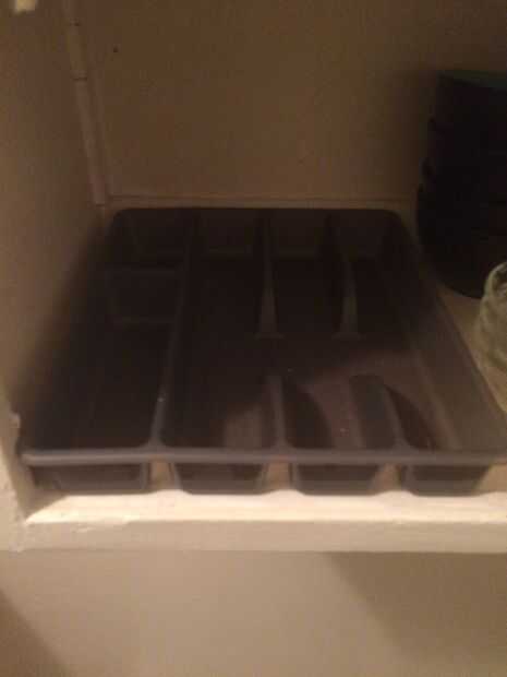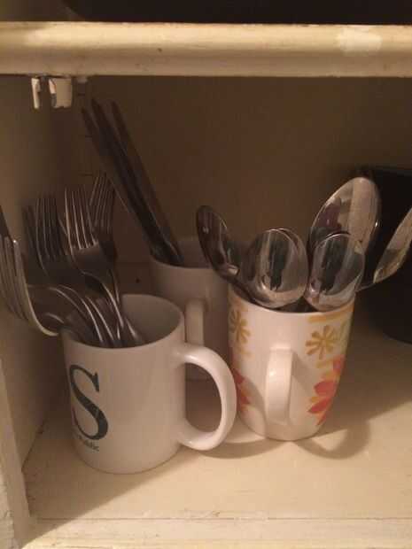 Cubiertos se colocan en tazas para un esquema de almacenamiento más vertical. Ver cuánto más cubiertos se pueden almacenar en un espacio que habría sido en vano con un organizador de utensilio plano.