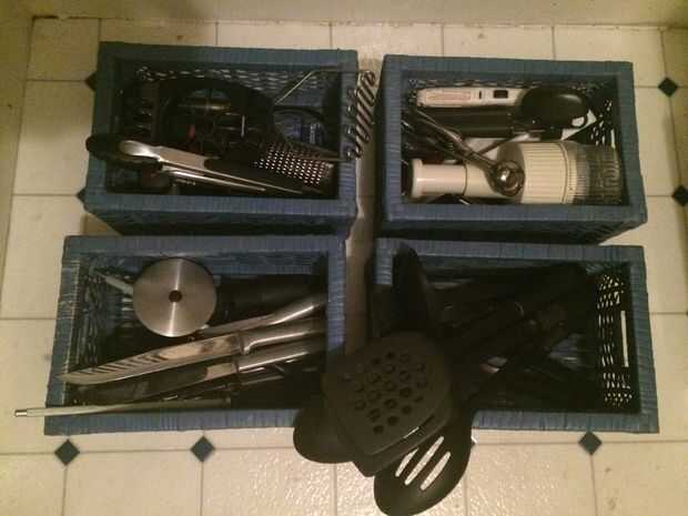 Todos mis cuchillos, revolviendo cucharas y otros utensilios de cocina para pequeño entraron en bandejas antes de ponerlos en los estantes.