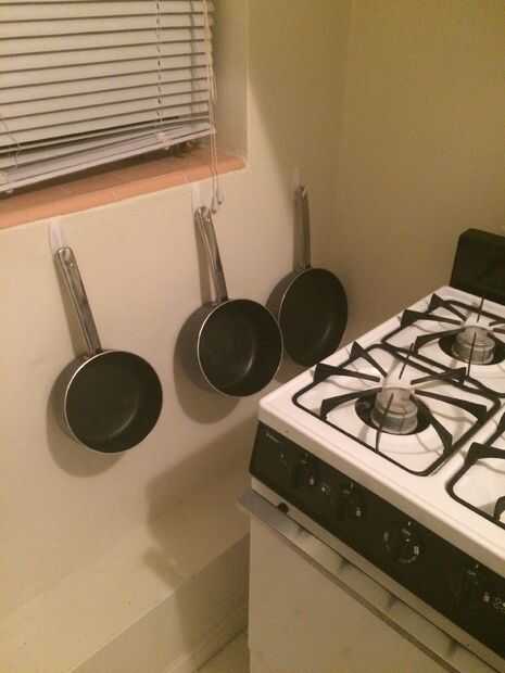 Esos ganchos adhesivos de 3M (disponible en farmacias) que pueden en mano para todas las ollas y sartenes que no encajaban en mis armarios. (Mi piso fue construido cuando todo era más pequeño).