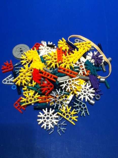 Necesita: conectores: amarillo-24 rojo-10 blanco-4 verde-8 azul 4 4 púrpura naranja-7 luz gris-1 gris oscuro-6 barras: amarillo-2 azul-12 blanco-18 verde-46 otros: banda elástica grande-1 pequeña rueda-2 gris espaciadores-20 azul espaciadores-8