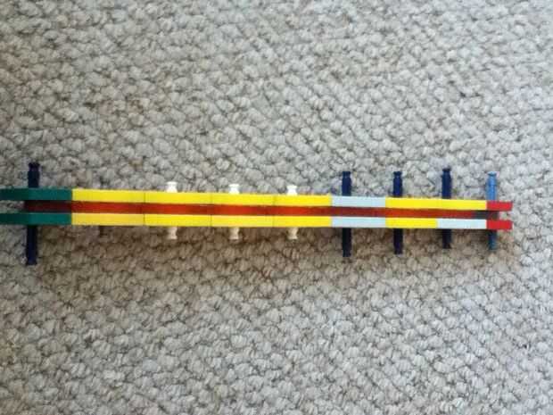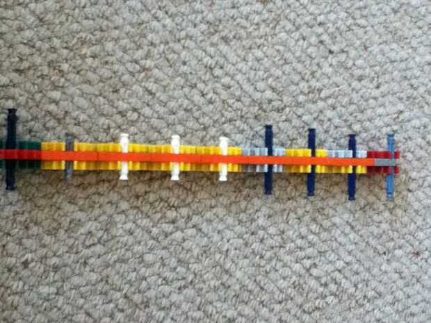 Paso 1: Conteo de piezas (opcional) Necesita: conectores: amarillo-24 rojo-10 blanco-4 verde-8 azul 4 4 púrpura naranja-7 luz gris-1 gris oscuro-6 barras: amarillo-2 azul-12 blanco-18 verde-46 otros: banda elástica grande-1 pequeña rueda-2 gris espac