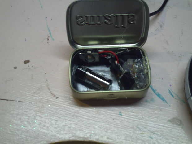 Poner el interruptor en la ranura que hiciste anteriormente y todo lo demás en exprimir. Pongo los cables a la batería en los lados opuestos del Altoid tin y llevó a cabo la batería de 12 voltios en bastante bien.