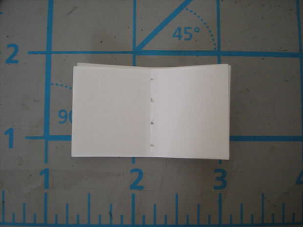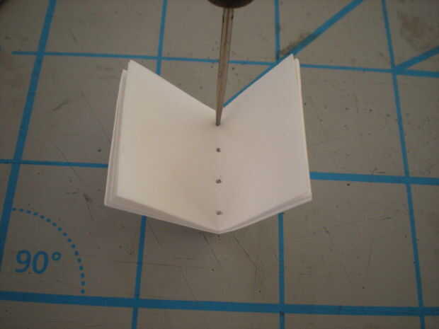 Marque cuatro puntos espaciados uniformemente a lo largo de la tapa de un folio como se muestra en la segunda imagen. Perfora agujeros en estas marcas con un punzón. Usando esta página como plantilla, perfore agujeros en la misma posición en todas las cuatro firmas (usted puede perforar una firma todo a la vez si usted tiene cuidado sobre manteniéndolos alineados).