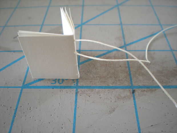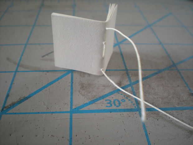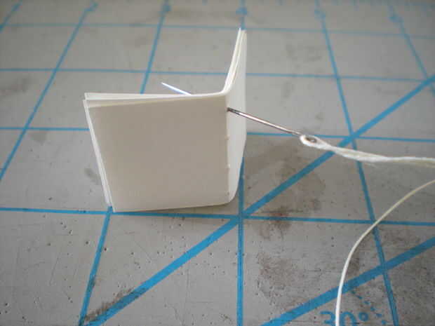 Para un libro de este tamaño, 12" de hilo es más que suficiente. Arrastre su hilo de rosca de lino a través de los tiempos beezwax dos o tres pegan las fibras y hacer más fácil coser con. Coser juntos la firma como se muestra, comenzando por ir el orificio superior.