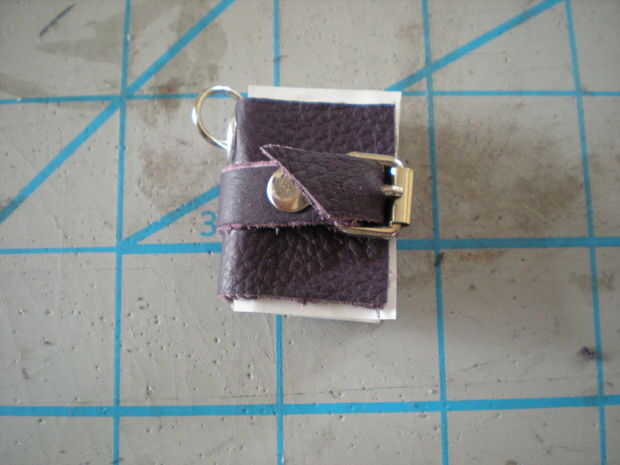 Utilice cemento de cuero para sujetar la correa a la cubierta. Anotando la cubierta ligeramente por debajo de la cola lo ayudará a pegar mejor. Hacer un agujero en la correa con su cuchillo exacto para la púa de la hebilla y enganchar el cinturón. Encuentra el libro a un lado para dejar que el cemento de cuero y encuadernación pegamento seco (preferiblemente durante la noche). Una vez todo seco, puede abrir el libro y quitar el papel encerado.