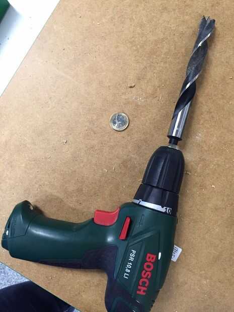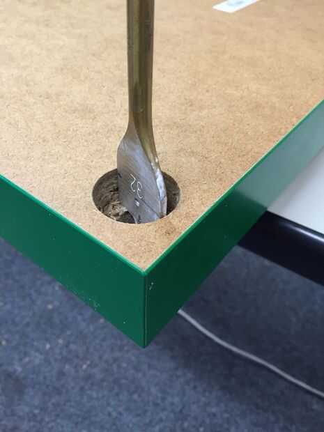 Ahora, haz el 32mm plana madera broca y marcar apagado el espesor de las tuercas que compraste en la broca. Poco a poco empezar a taladrar en la esquina de la parte inferior del tablero. Si está utilizando un taladro de mano, intentar ser lo más recto posible. Idealmente, usted estaría utilizando un taladro para esto. Hacer el agujero sólo un poco más profundo que la altura de la tuerca M18.