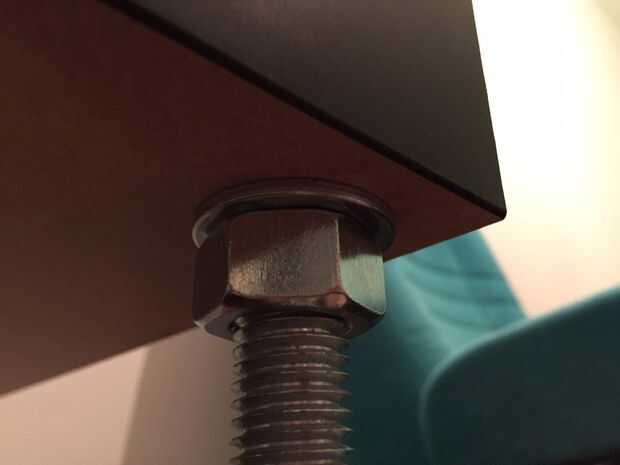 Ahora, coloque el tablero superior de las barras y empújela hacia abajo hasta que descanse sobre las tuercas y arandelas de que ponemos en justo antes. Esto puede requerir un poco de fuerza o moviendo el tablero alrededor. Trate de hacer pequeños movimientos en las diferentes barras, comparadas con los grandes en una sola barra, que hagan las otras barras de inclinación en sus agujeros y bloquear cualquier otro movimiento.