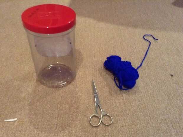 1. un frasco de plástico o cartón. (Yo usé plástico, pero mejor utiliza cartón) 2. una herramienta de corte 3. cadena 4. cinta (no en la imagen) 5. papel (no en foto)