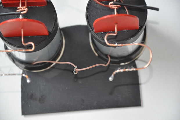 Aunque ya completamente funcional, los tarros de Leiden y el mecanismo en su zócalo están todavía separados y sueltos. Girando la manivela hace todo tambalearse y las tiras de frágil en el disco se dañe por golpear el peine.