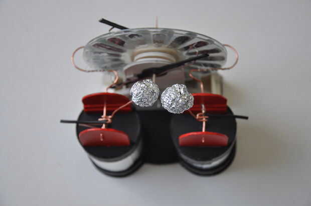 Son dos piezas largas de alambre de cobre rígido con 2 curvas de u que se exprimen con los alicates alrededor del alambre de cobre sobre los tarros de Leiden.