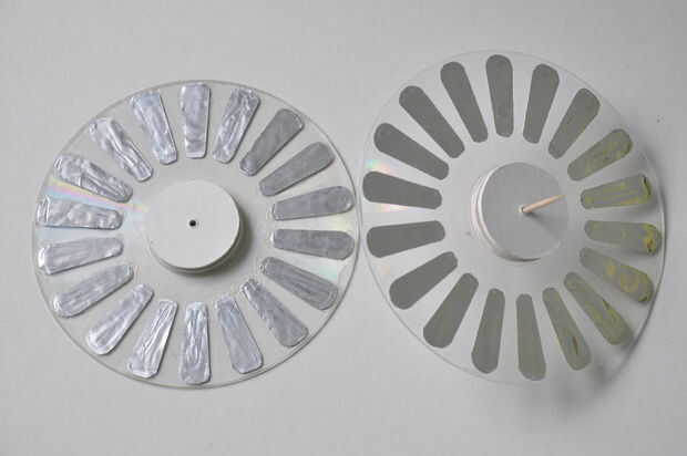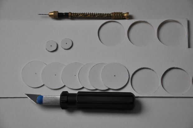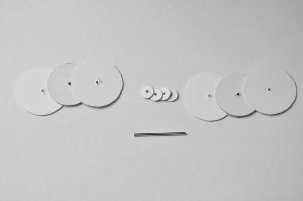 Las ruedas a los CDs consisten en 3 discos grandes (diámetro ≃ 38 mm para ello cabe en ese pequeño anillo lleno de baches en un CD) y un pequeño disco (diámetro: sólo pequeñas, no mido, no importa mucho. Mira a la primera foto.) El cartón es de unos 1,2 mm de espesor de los discos grandes y 1,5 mm para el disco interno, pequeño. (Pero los espesores no son importantes, como una banda de goma se encaja en la rueda)