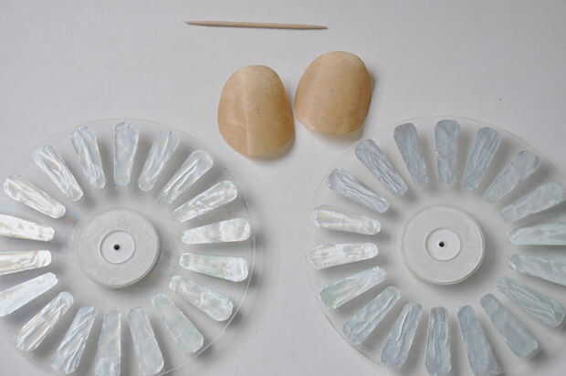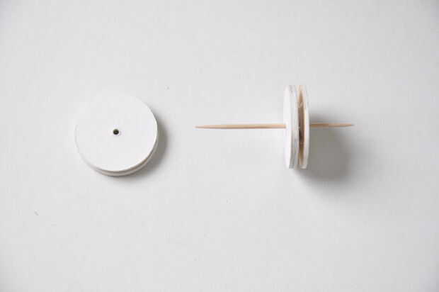 En cada uno, un agujero es perforado en el centro y agrandado para que puede insertar un palillo de dientes sin mucha fricción. Todo es arena alrededor del agujero para que no hay restos de perforación de los orificios se peguen hacia fuera.