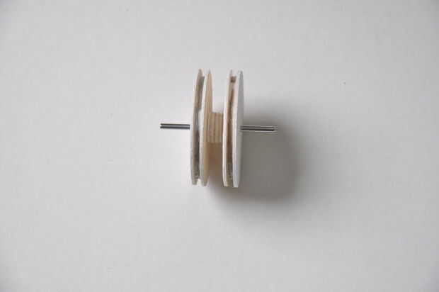 Como un eje conductor, he usado una varilla metálica pequeña que estaba ahí, pero sugiero fuertemente para utilizar madera u otra cosa porque es muy difícil de fijar las ruedas (y más tarde la manivela) en el eje conductor con pegamento.