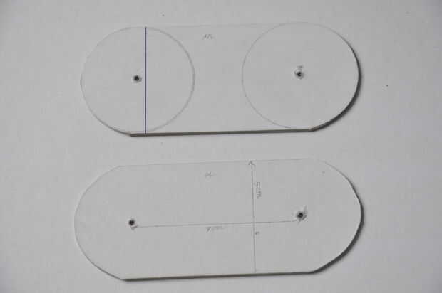 La infraestructura sobre la cual se montan las ruedas y los ejes son dos pedazos de cartón. La forma de la pieza de cartón se construye mediante el dibujos dos círculos con un diámetro de 5 cm con sus centros separados en cartón de 1,5 mm de espesor 7 cm. (Tenga en cuenta que esta forma es probablemente demasiado amplia, como he notado bien, delgados arcos salto de los peines a la cartulina. tal vez 3 cm de ancho círculos habría sido mejores. Ver el paso de "Depuración" en cómo se prevenir esos pequeños arcos. )