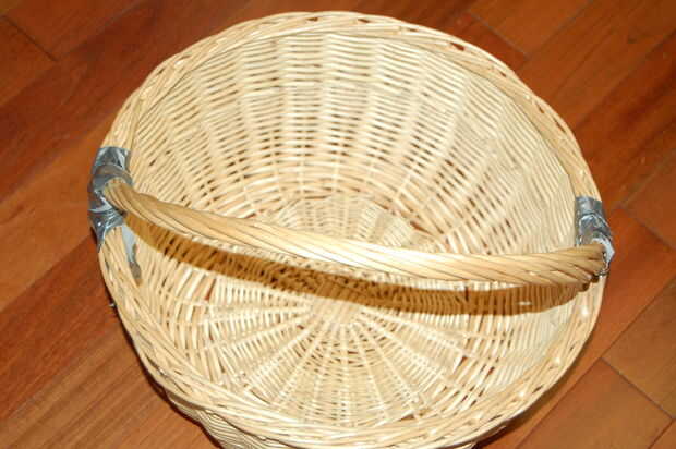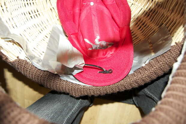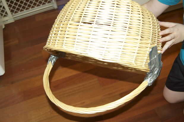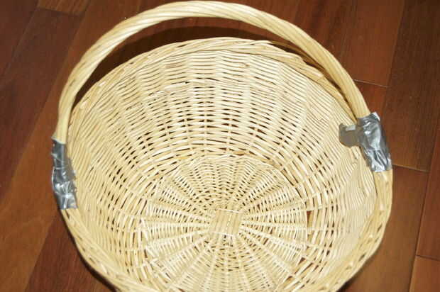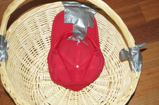 Toma la canasta y doblar el mango hacia abajo para que permanezca en un ángulo. El ángulo depende de cuán grande quieres tu sonrisa para ser. Una vez que se han doblado hacia abajo y se queda, pato cinta la parte donde se conecta el mango con la cesta. (la empuñadura se romperá un poco así que frustrado de no romperlo, pero no presionar derecha). Después de haber hecho que usted puede comenzar a conectar el sombrero. Cuando lo hice comencé a pato a grabar hasta el borde. Que no funcionan, así que compré un montón de zap correas, primero puse uno a través de la parte superior de la cesta y la parte superior del sombrero, (Asegúrese de que el borde del sombrero es sobre el borde de la canasta y tocar ella) entonces puse otro zap las correas a través de la visera y la cesta otra vez.