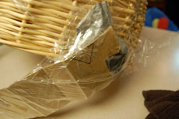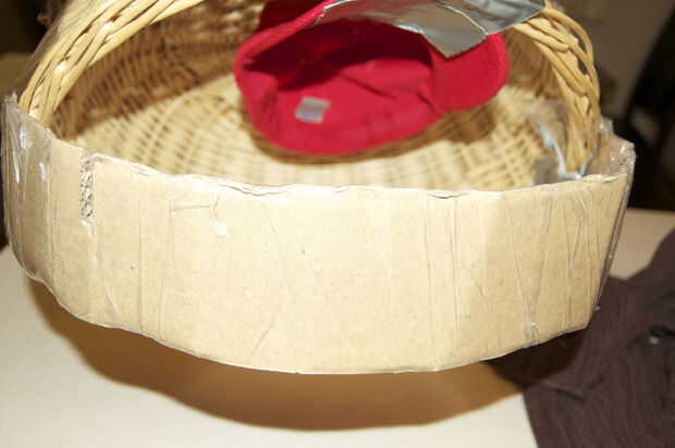 a continuación tomar la cartulina y cortar una tira hacia fuera, el tamaño de la tira debe ser de acuerdo a cuán grande quieres tu sonrisa para ser. Cuanto más grande la tira de cartón más pequeño la sonrisa. envolver el cartón alrededor de la manija de la cesta doblado Asegúrese de que todo el cartón cubre la manija y todo es tocar. luego con cinta adhesiva la cartulina a la canasta en los extremos de la cartulina. Tendrá un montón de cinta!