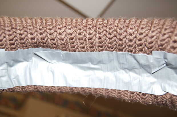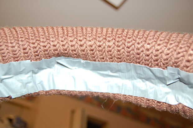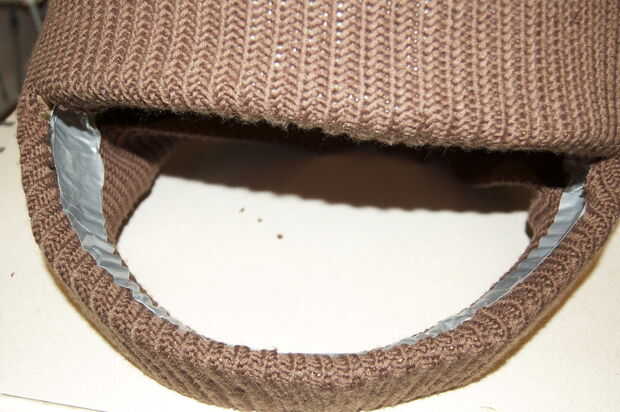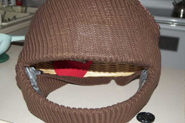 Siguiente tienes que cortar una línea a través del centro de la boca, doblar la mitad superior para arriba por lo que se redondea el borde de la cesta, pato la cinta allí. doblar la parte inferior la mitad hacia abajo se redondea para que pieza de la cartulina (la boca), pato y pato cinta hay junto a la parte inferior que está colgando sobre el mango de la cesta, pliegue con cinta adhesiva ambas.