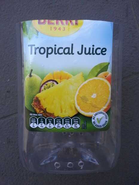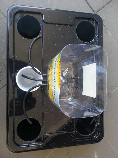 • Después los vasos de plástico, debemos preparar la botella de jugo. Tenemos que cortar la parte superior de ella y también hacer 6 agujeros (3 por cada lado), lo suficientemente ajustado para que el pequeño tubo plástico flexible sólo ajuste a través de él, para llegar a los 6 vasos de plástico. Los 6 orificios deben ser a la misma altura, para que el agua llega a cada taza en la misma proporción.