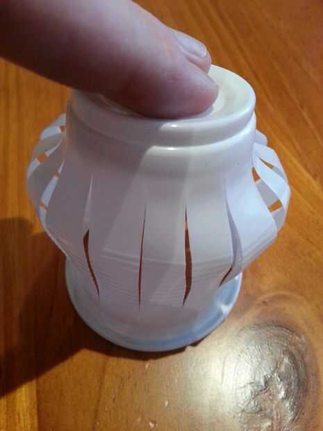 • En este punto el cuadro está listo. Tendremos que preparar los 6 vasos de plástico. Tenemos que cortar a los lados (según el cuadro), para que las raíces y el agua pueden pasar a través de los cortes verticales (cuidadosos de no lastimarse si se utiliza un cortador!).
