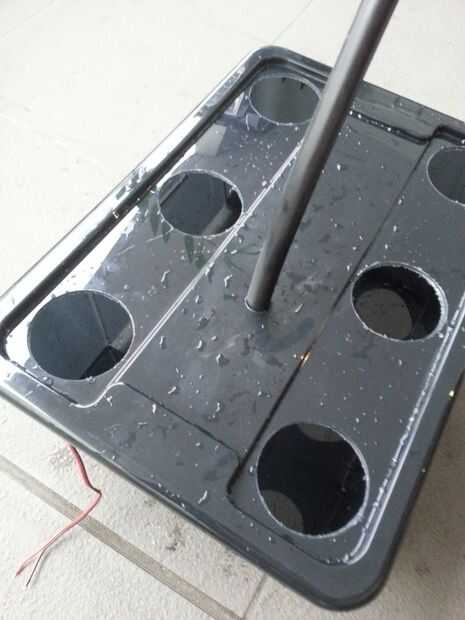 • Necesitamos dos agujeros adicionales, uno hacia el centro de la caja hacer la pipa plástica Acomódesela en su interior, es el segundo agujero en uno de los lados para el alambre eléctrico de baja tensión de la bomba (ver fotos).