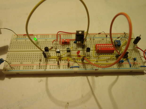 El diseño evolucionó a través de varias etapas en el protoboard. Empecé con un diodo para protección de polaridad inversa. Más tarde me di cuenta de que sería mejor un FET de canal P.