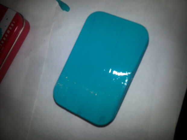 Pintar la tapa lata en un color verde azulado. Mientras que se está secando, utilice otra lata para trazar un cuadrado que va a utilizar para su telón de fondo.