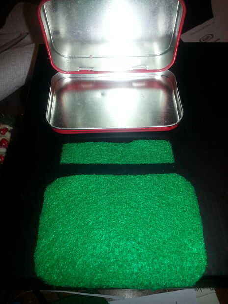 Ahora, mientras que se está secando, corte un cuadrado verde fieltro pieza que servirá como el patio de la casa de las pixie. Obtener el tamaño adecuado seguimiento la lata (no pintada) y cortar. También tendrá una franja verde que estará sentado en la parte inferior del labio mayor dentro de la bandeja.