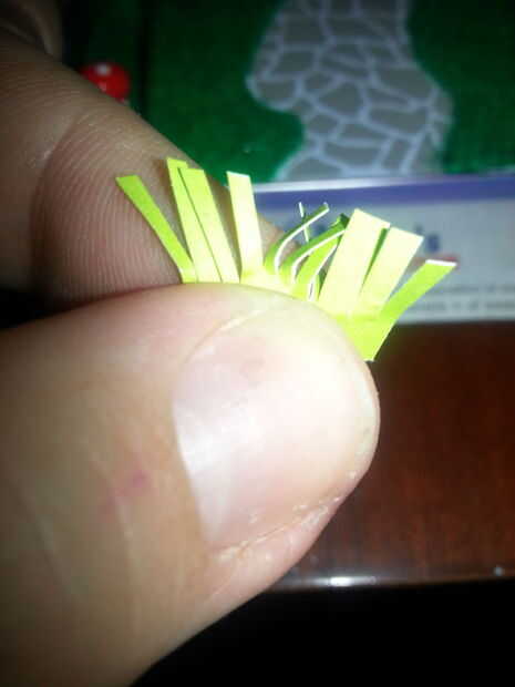 Cortar un pequeño mechón de pasto por flecos de papel verde. Pegamento en ambos lados de la puerta.
