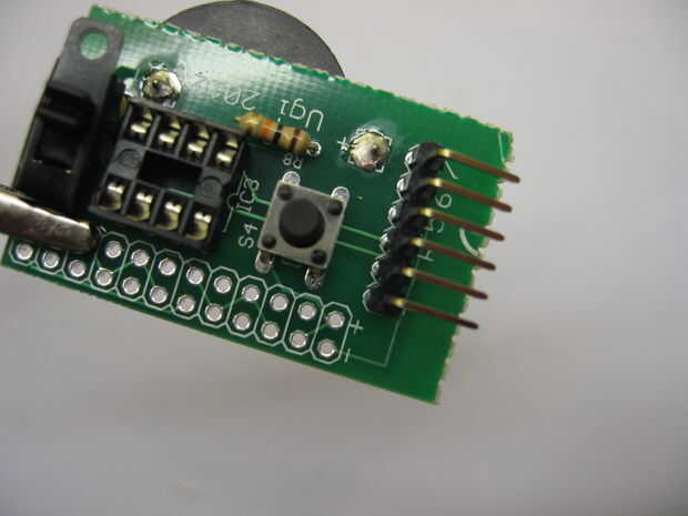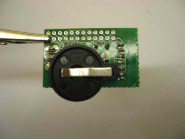 Permite en primer lugar, coloque el pasador de 90 grados encabezados para la programación - apenas deslizan en y soldadura. Como ves, hay sólo espacio para caber un hierro más allá del soporte de pilas.