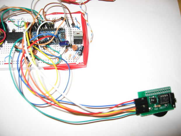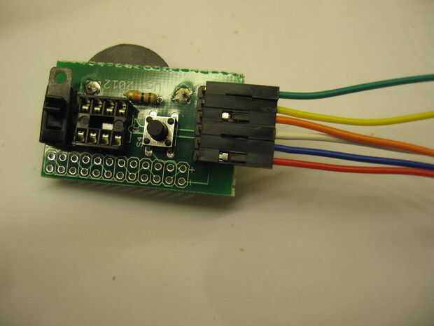 Para usar Arduino como programador, siga ' ible - esencialmente, Únete + 5V, - a la tierra, primero en D10 y 5, 6, 7 D11, D12 y D13. La tercera imagen muestra la pequeña junta con los puentes de conexión añadidos y el cuarto muestra enganchadas a mi nano, que vive en un protoboard rodeado de caos.