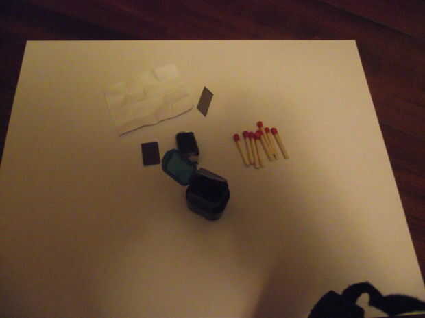Hay un metro de cinta aislante que envuelve el contenedor. Hay 8 fósforos, una luz de una luz globo, papel con contactos, navaja y un delantero. Incluso con todo lo que todavía hay espacio para una pastilla. El papel se puede utilizar para un iniciador de fuego. Esto se hace de una caja de mini tic tac.