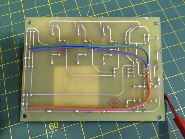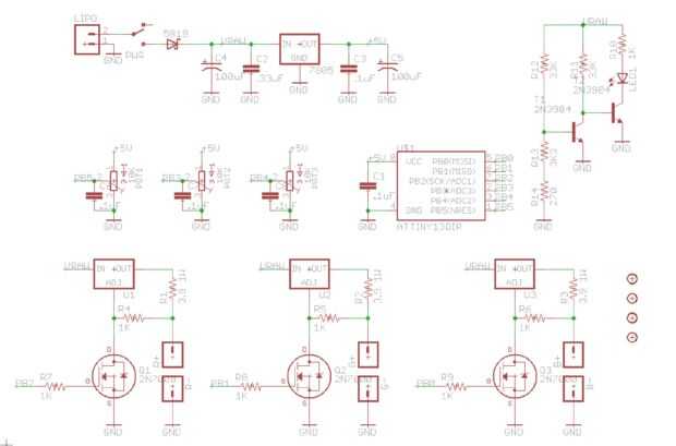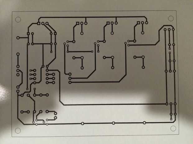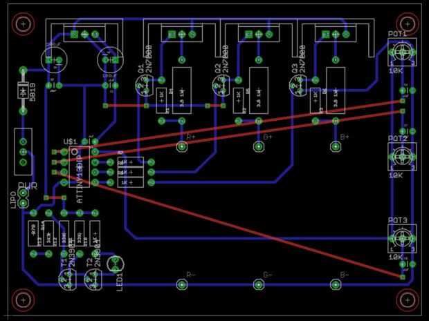 Mi águila esquemática y diseño se unen, así como la impresión a los rastros de la Junta que usé para grabar el PCB. Hay unos cables de puente encima de la placa ya que tengo todavía intentar grabado doble cara. Los tres cables de las macetas para el ATtiny también aparecen en la parte superior del tablero, aunque para que se vea mejor, ponerlos en la parte posterior del tablero mediante cables aislados.